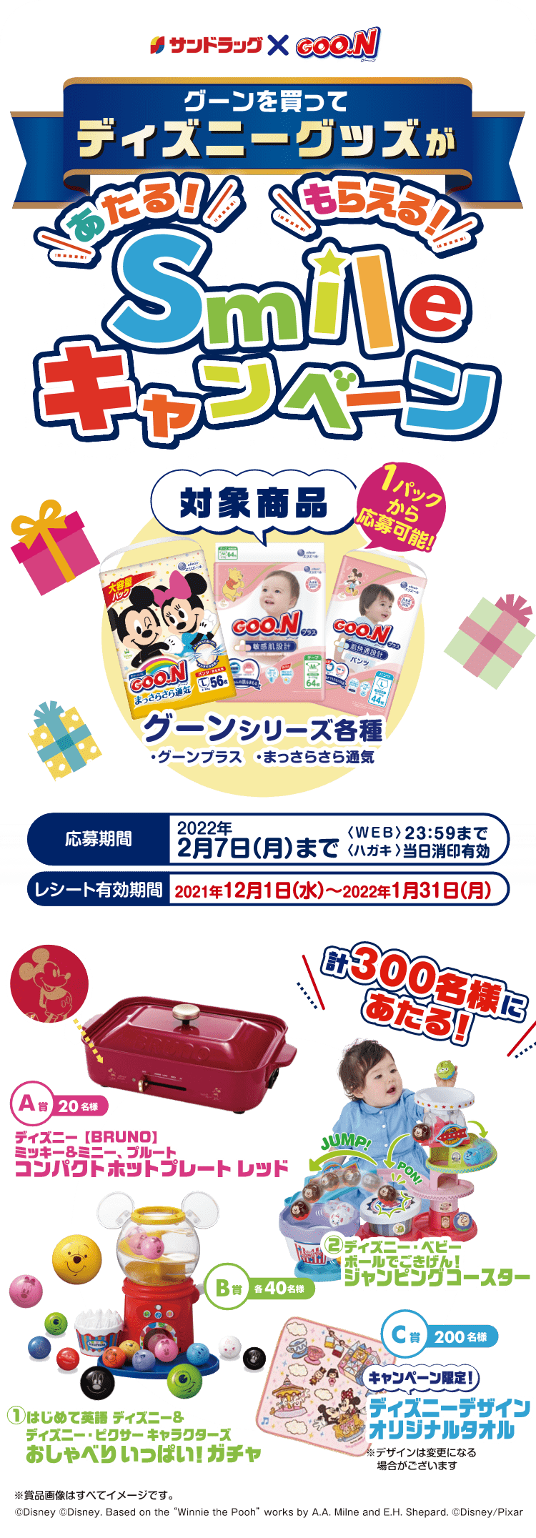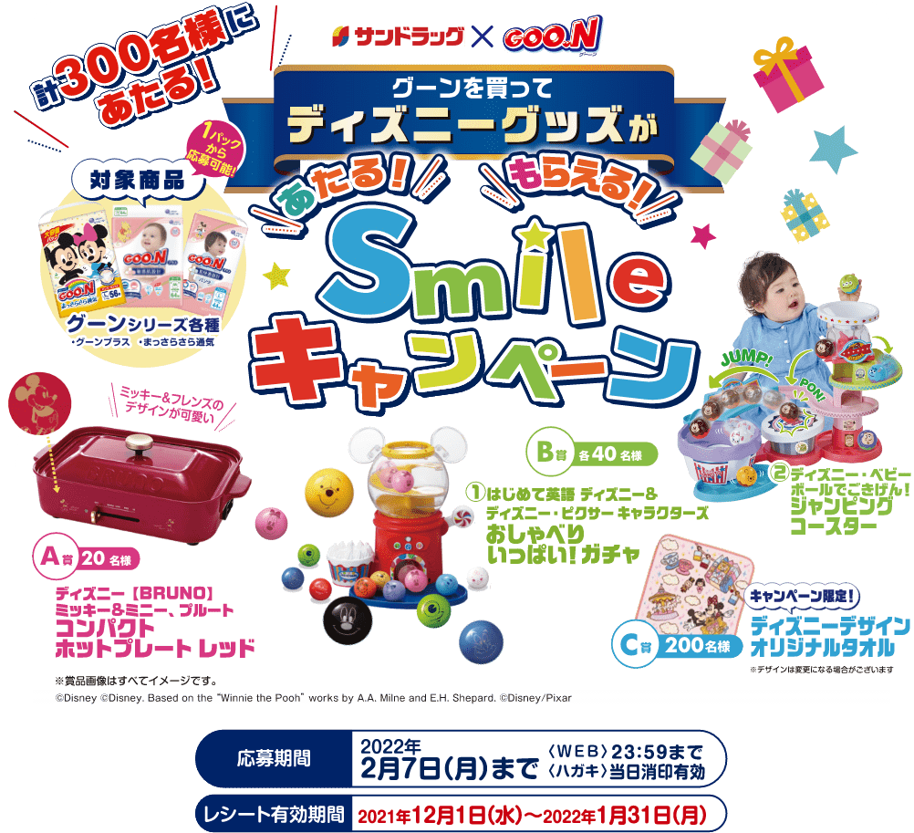 大王製紙株式会社(以下、当社といいます)が主催する「サンドラッグ限定「あたる!もらえる!Smileキャンペーン」(以下、「本キャンペーン」といいます)」に応募される前に本規約をよくお読みになり、ご同意いただける場合に限りご応募ください。応募された場合、ご同意いただいたものとみなします。