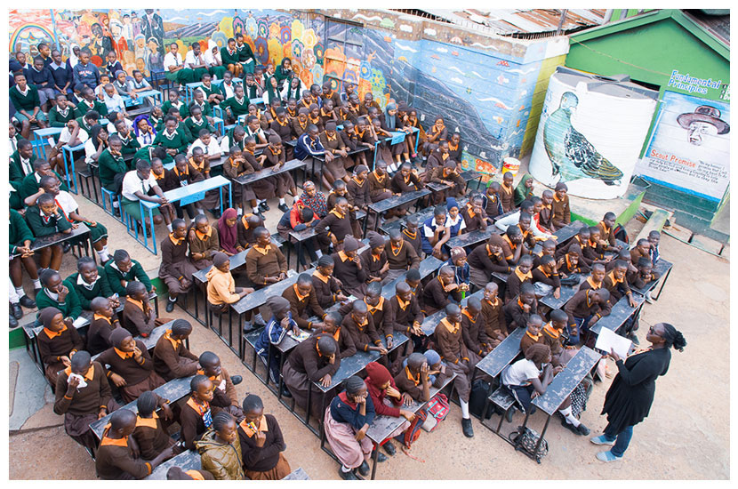 この日はスラム街キベラのなかにある孤児と貧困児童のための学校「マゴソスクール」にて、同じくキベラ内にある12校のプライマリースクール(日本の小学校~中学校にあたる)と、2校のセカンダリースクール(日本の高校にあたる)の代表者に集まってもらい、月経教育と生理用ナプキンの配布が行われました。