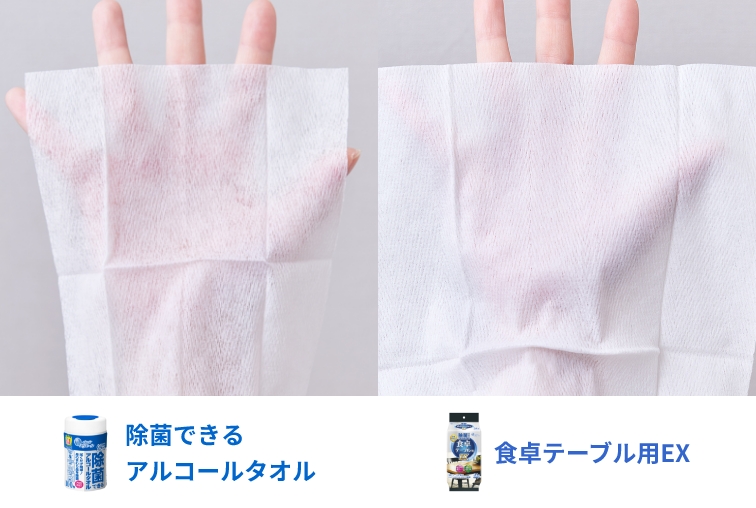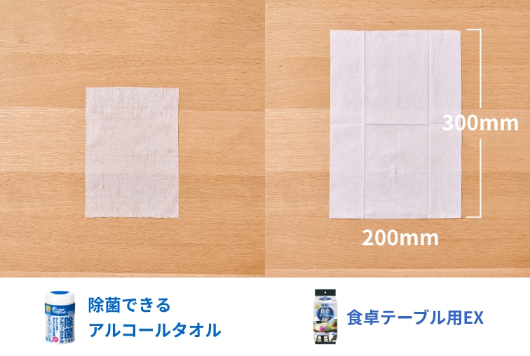 シートの大きさも厚さも通常の「除菌できるアルコールタオル」の1.5倍という
