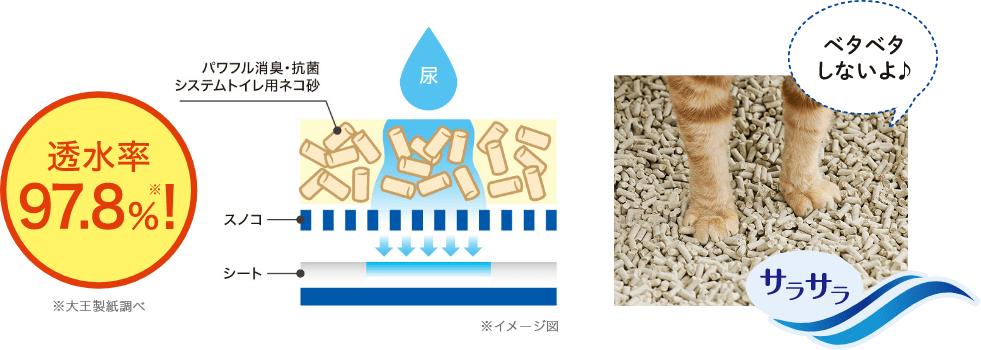 ほとんどの水分を通過し、さらに砂の表面に残ったおしっこも素早く吸収。砂の上におしっこが残りにくいのでキレイ好きなネコちゃんも気持ちよくトイレを使えます。