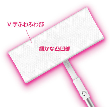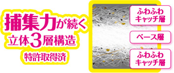 「立体3層構造」シートの内側に汚れを閉じ込めるので、汚れを逃がさず捕集。細かいデコボコとV字起毛部分でホコリ・髪の毛を絡め取る。