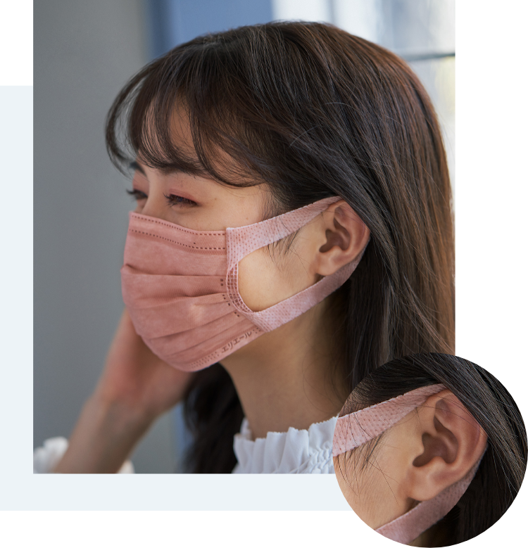 長時間つけていても耳が痛くなりにくい、独自の「やわらかフィット耳掛け」を採用。紙おむつの技術を活かした伸縮性のある幅広のやわらかい素材が耳に面で接し、やさしくフィットします。