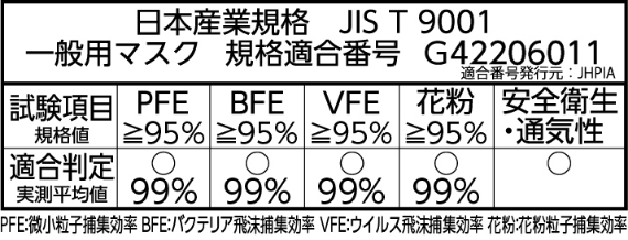 不織布3層構造と高機能フィルター採用で、ウイルス飛沫、かぜ、花粉、ハウスダスト、PM2.5の侵入を防ぎます。JIS適合番号「JIS T9001」も取得しました。
