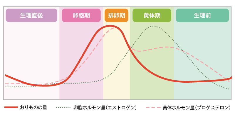 おりものは、色や性質だけでなく量も変化します。これは、おりものが女性ホルモンのひとつである、エストロゲン(卵胞ホルモン)と深い関係があるため。