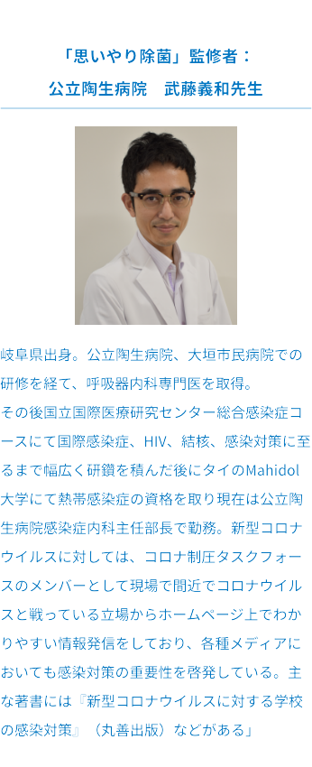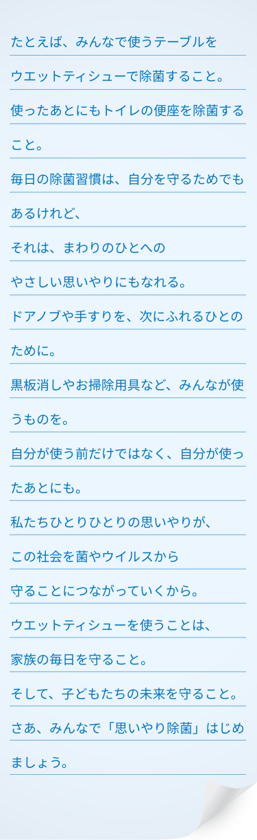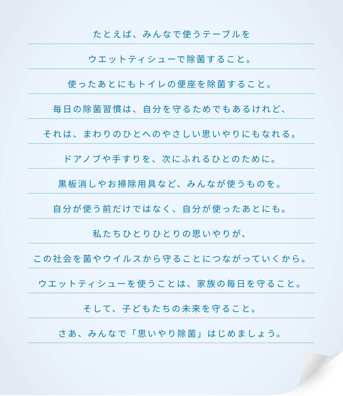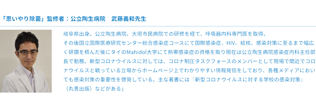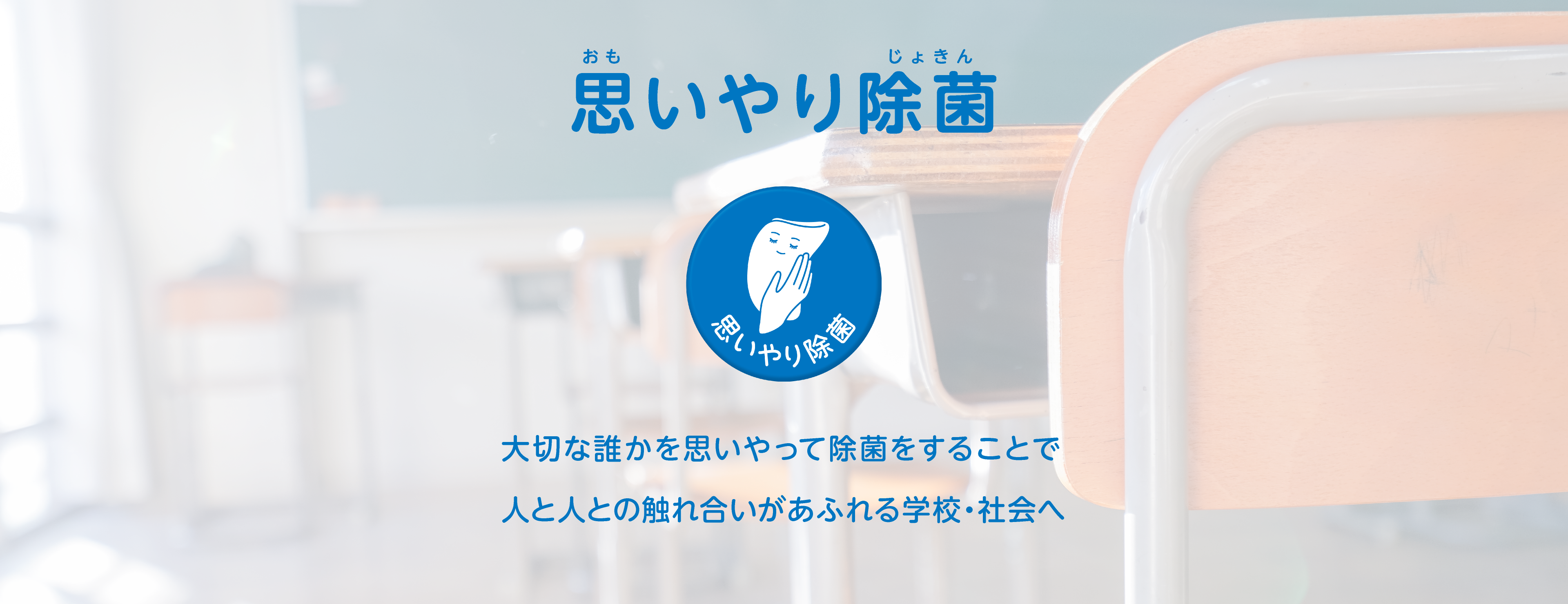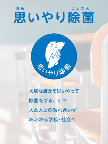 「思いやり除菌」とは 自分のためだけでなく、大切な誰かを思い、 正しく除菌をすることによって、 誰もが安心して触れ合うことができる学校・社会を目指す活動です。 「思いやり除菌」が未来のあたり前の習慣となることで、 社会を菌やウイルスから守ることにつながると考えています。 未来を担う子どもたちのために、除菌教育をサポートいたします。