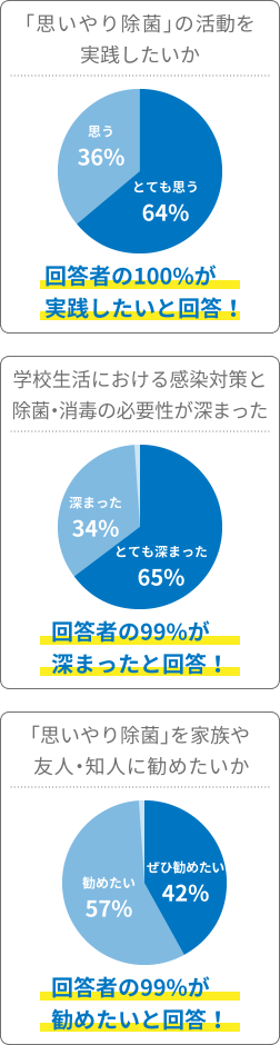 今回、アンケートにご回答いただいた全ての小学校から、「思いやり除菌に参加して良かった」との評価をいただきました。また、約98%の小学校からは、「思いやり除菌を今後も継続していきたい」というお声をいただきました。