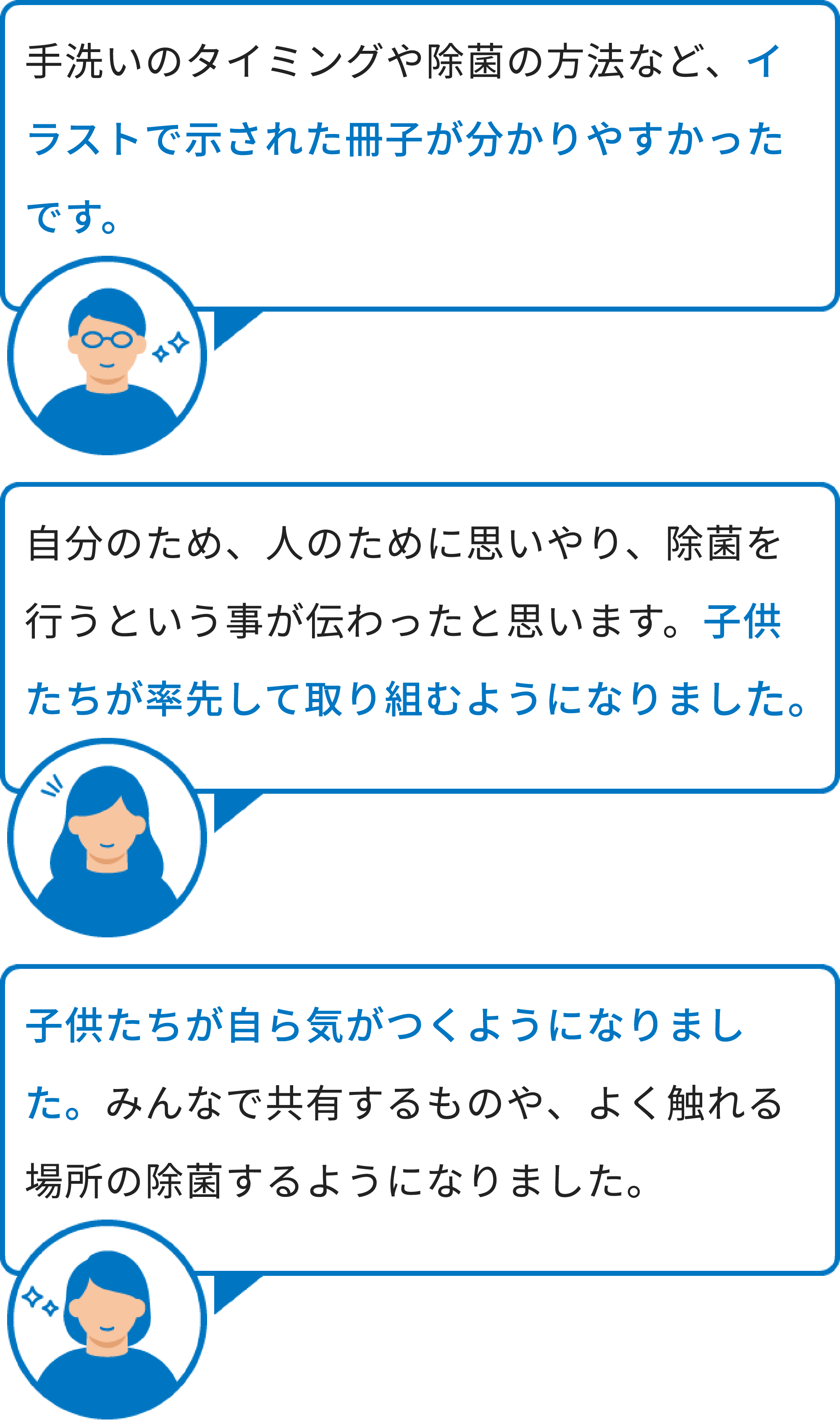 今回の「思いやり除菌」活動について、小学校の先生方からコメントをいただきました。