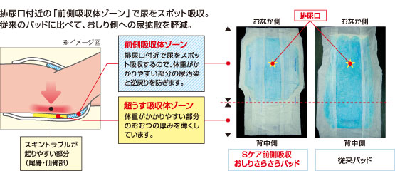 前側吸収ゾーンで尿を吸収して尾骨・仙骨部に流れにくい。