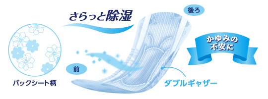 トイレまで間に合わず、外出時不安な方に。水分をすーっとひきこむさらさら持続シート。